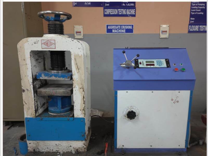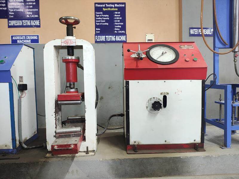 | 2 | ![]()  | Flexure Testing Machine | Capacity – 100 kN Type of Pumping – Manual Loading capacity – 0 to 100 kN Least Count – 0.5 kN Type of Loading – Third Point Loading Make – Enkay