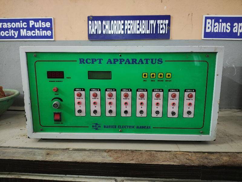 | 4 | ![]()  | Water Penetration Test Equipment | Pressure cell: 0–15 kg/cm² Sealing system: Rubber gaskets Water supply: Stainless steel reservoir with inlet/outlet Pressure gauge: 0–15 kg/cm², least count 0.1 kg/cm²