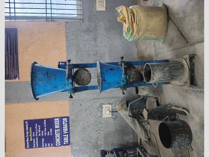 | 9 | ![]()  | Vee-Bee Consistometer | Slump cone Height: 300 mm  Cylindrical Container Internal diameter: 240 mm  Electric motor (0.5 HP) driving an eccentric shaft to produce vibration.